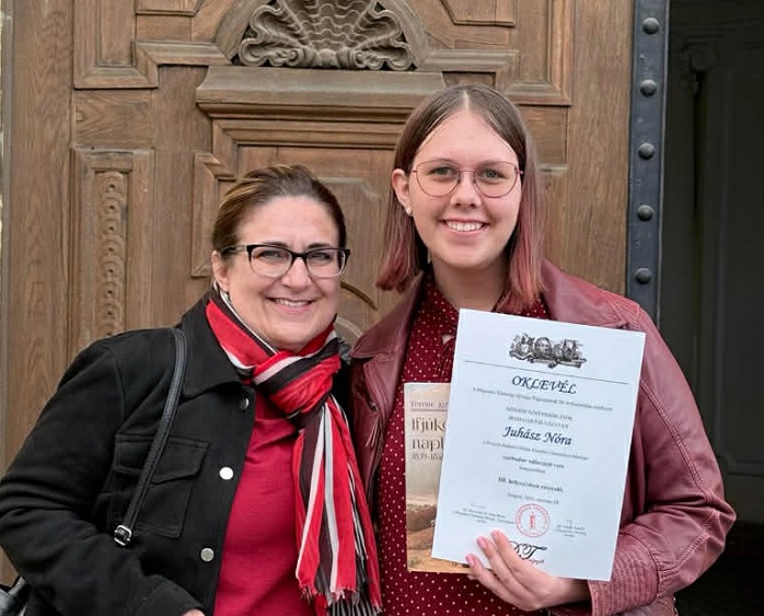 A Dugonics Társaság Ifjúsági Tagozata által március végén a szegedi önkormányzat dísztermében megrendezett XXVI. Középiskolás Művészeti Fesztivál és Irodalmi Pályázat gálaműsorán Juhász Nóra (9.D osztályos, humán tagozatos tanulónk) ünnepélyes keretek között vehette át a társaság pályázatán elért 3. helyezéséért járó oklevelet és könyvjutalmat. Nóri a szabad témájú kategóriában egy nővéréhez írt verssel pályázott. Felkészítő tanára: Gera Csilla.